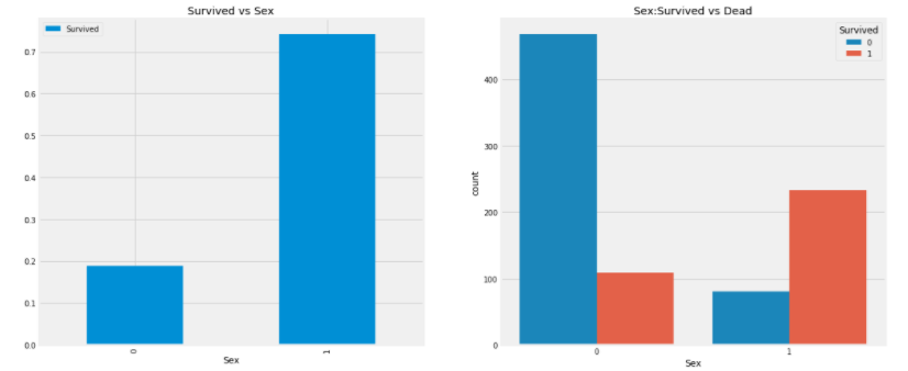 - ax[0] :: data의 Sex와 Survived만 뽑아 낸 후, Sex로 그룹화를 시키고 평균을 구함 > plot.bar로 시각화