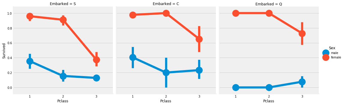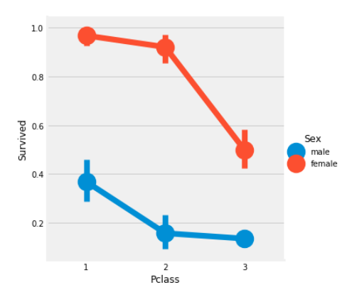 >> Pclass가 1~2인 여성의 생존율은 거의 1에 가깝지만 Pclass 3인 여성의 생존율은 50%임을 확인할 수 있다.