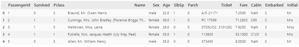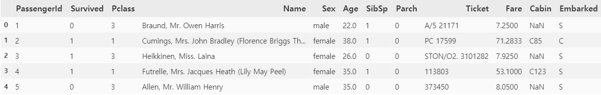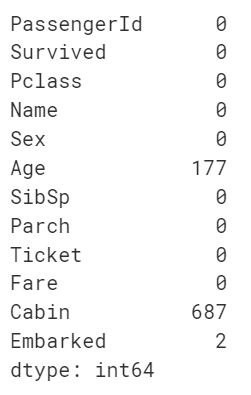 - Age 177개 / Cabin 687개 / Embarked 2개 결측치 존재