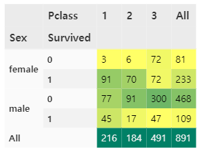 pd.crosstab([data.Sex, data.Survived], data.Pclass , margins = True).style.background_gradient(cmap = 'summer_r')