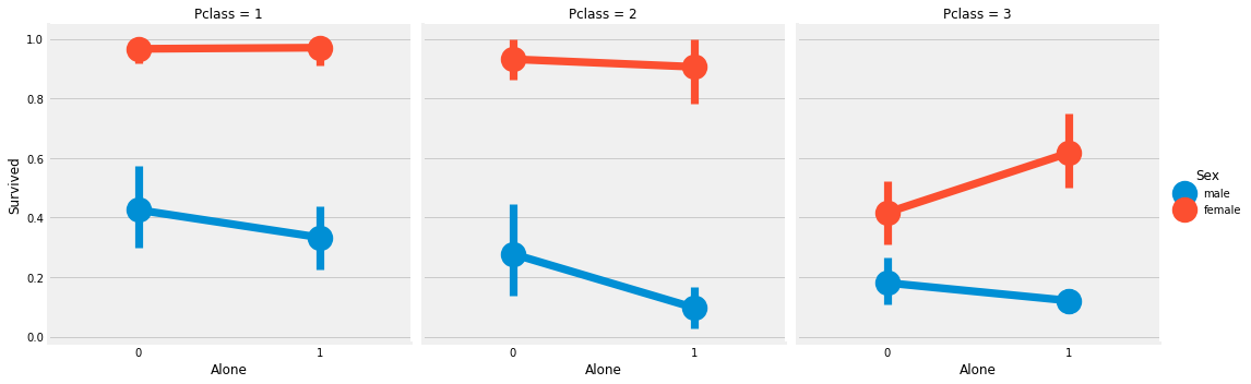 >> 여성 기준으로는 Pclass 1~2 탑승객은 거의 생존하며, Pclass3은 남성과 반대로 생존율이 혼자온 사람이 더 높다.