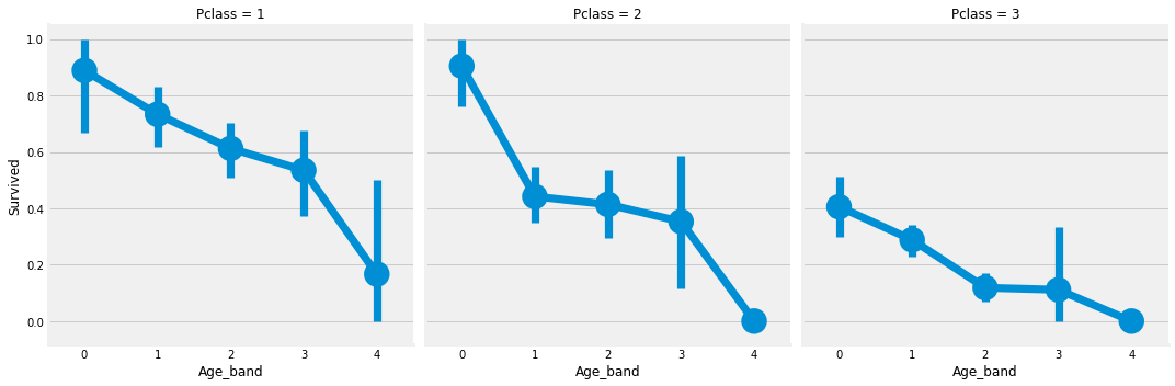 >> Pclass와 상관없이 나이가 증가할수록 생존율이 감소하고 있다.