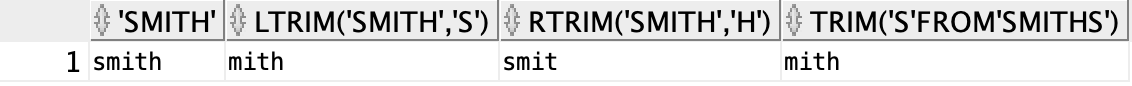 SELECT 'smith', LTRIM('smith','s'), RTRIM('smith','h'), TRIM('s' from 'smiths')