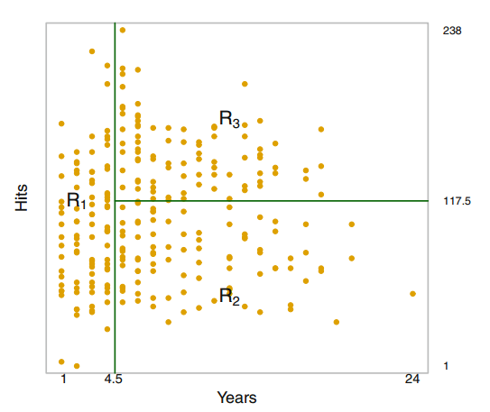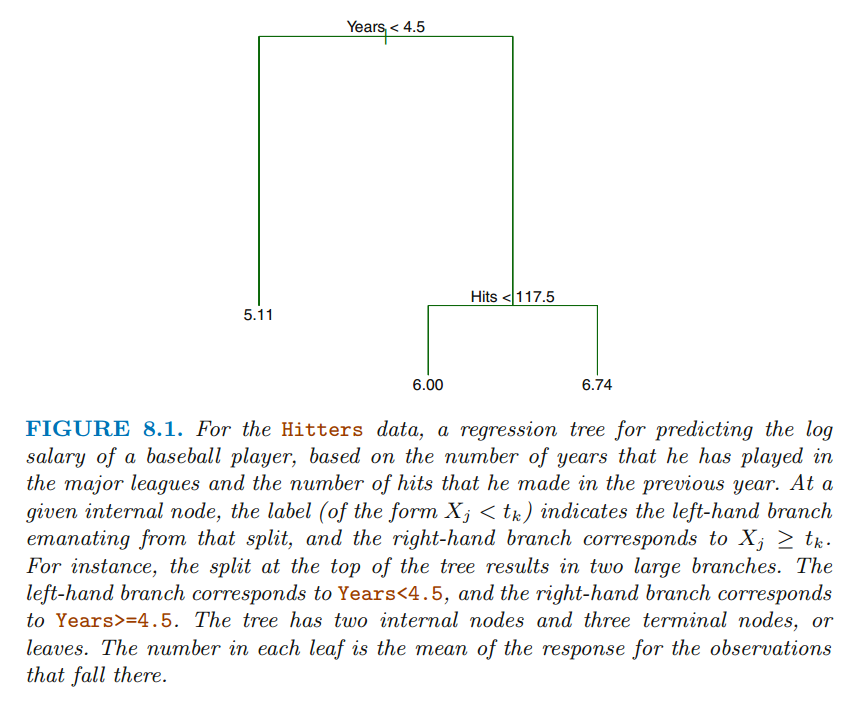 FIGURE8.1에서 가지가 나눠지는 부분, Years < 4.5 & Hits < 117.5 가 위치한 곳을 internal node라고 부릅니다.