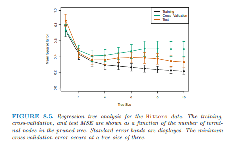 하지만, Test data의 MSE와 CV MSE는 Tree Size가 3일 때 가장 작은 것을 확인할 수 있다.