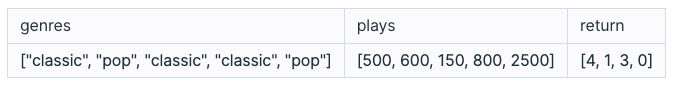 - plays[i]는 고유번호가 i인 노래가 재생된 횟수입니다.