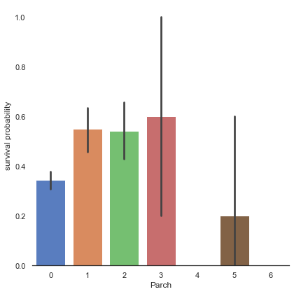g = sns.factorplot(x = "Parch", y = 'Survived', data = train , kind = 'bar', size = 6, palette = 'muted')