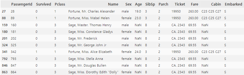 >> 28,89,342 탑승객은 Fare 값이 너무 높고, 나머지 7명은 SisSp가 너무 높다.