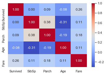 g = sns.heatmap(train[['Survived','SibSp','Parch','Age','Fare']].corr(), annot = True , fmt = ".2f", cmap = 'coolwarm')