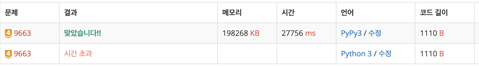 같은 코드인데, python3으로 하니깐 시간 초과이고, PyPy3으로 하니깐 성공.... (두 언어 무슨 차이지...)